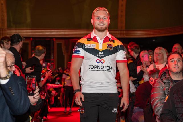 Mitch Souter models Bradford’s eye-catching new home jersey for the club’s return to the Super League at Bradford Live on Tuesday night (Image: Tom Pearson)